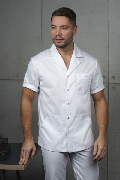 Блуза мужская медицинская "Скай" белого цвета имеет удобный короткий рукав с отворотами, прямой силуэт и классический отложной воротник с лацканами. Модель дополнена нагрудным карманом с вышивкой и функциональными боковыми карманами.