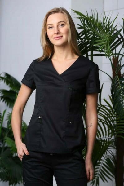 Блуза Альфа черного цвета имеет удобную модель без застежек, короткий рукав с отворотом и прилегающий силуэт. V-образный вырез и стрейч-эффект позволяют легко надевать и снимать блузу. Модель дополнена декоративной петелькой на груди и тремя накладными карманами по бокам, на одном из которых есть пуговица-смайлик.