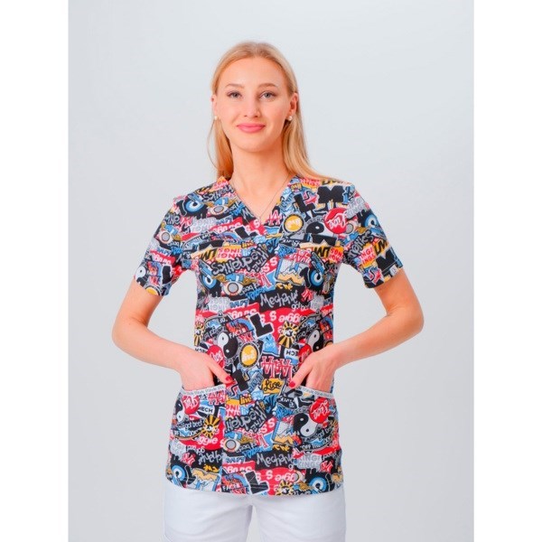 Женская медицинская блуза "Витерра" с веселым ярким принтом имеет полуприлегающий силуэт с удлиненной спинкой, V-образный вырез и короткий рукав. Модель дополнена двумя боковыми карманами