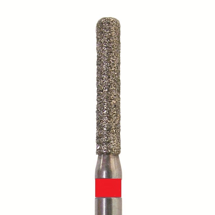 Бор алмазный для турбинного наконечника. Общая длина 19 мм, диаметр рабочей части 1,2 мм. Зернистость сверхгрубая 151-213 мкм, цветовая кодировка красная. В упаковке 5 шт. Форма: цилиндр с закругленным концом.