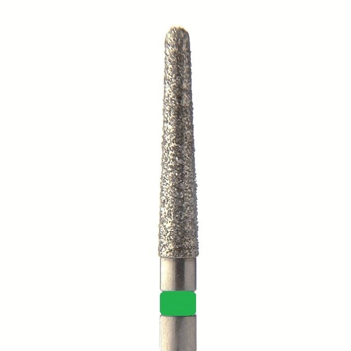 Бор алмазный для турбинного наконечника. Общая длина 19 мм, диаметр рабочей части 1,2 мм. Зернистость грубая 107-181 мкм, цветовая кодировка зеленая. В упаковке 5 шт. Форма: конус с закругленным концом. Артикул 852G.314.012.