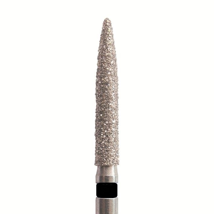 Бор алмазный для турбинного наконечника. Общая длина 19 мм, диаметр рабочей части 1,8 мм. Зернистость средняя 64-126 мкм, цветовая кодировка черная. В упаковке 5 шт. Форма: цилиндр с заостренным концом.