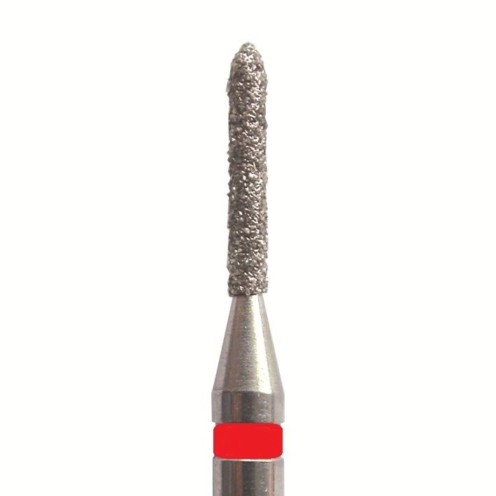 Бор алмазный для турбинного наконечника. Общая длина 19 мм, диаметр рабочей части 1,6 мм. Зернистость тонкая 27-76 мкм, цветовая кодировка красная. В упаковке 5 шт. Форма: цилиндр с усеченным концом. Артикул 868F.314.016.