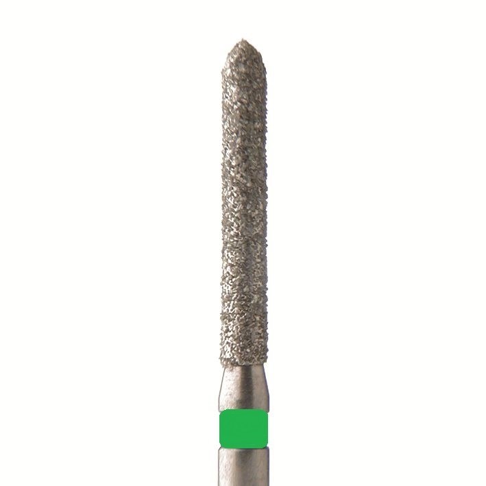Бор алмазный для турбинного наконечника. Общая длина 19 мм, диаметр рабочей части 1,4 мм. Зернистость грубая 107-181 мкм, цветовая кодировка зеленая. В упаковке 5 шт. Форма: цилиндр с усеченным концом. Артикул 869G.314.014.