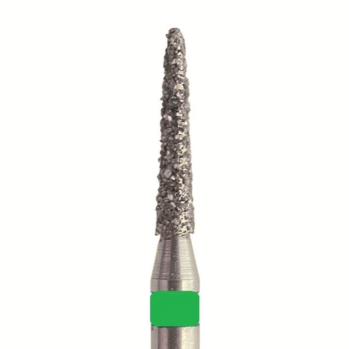 Бор алмазный для турбинного наконечника. Общая длина 19 мм, диаметр рабочей части 1,4 мм. Зернистость грубая 107-181 мкм, цветовая кодировка зеленая. В упаковке 5 шт. Форма: пуля. Артикул 877G.314.014.