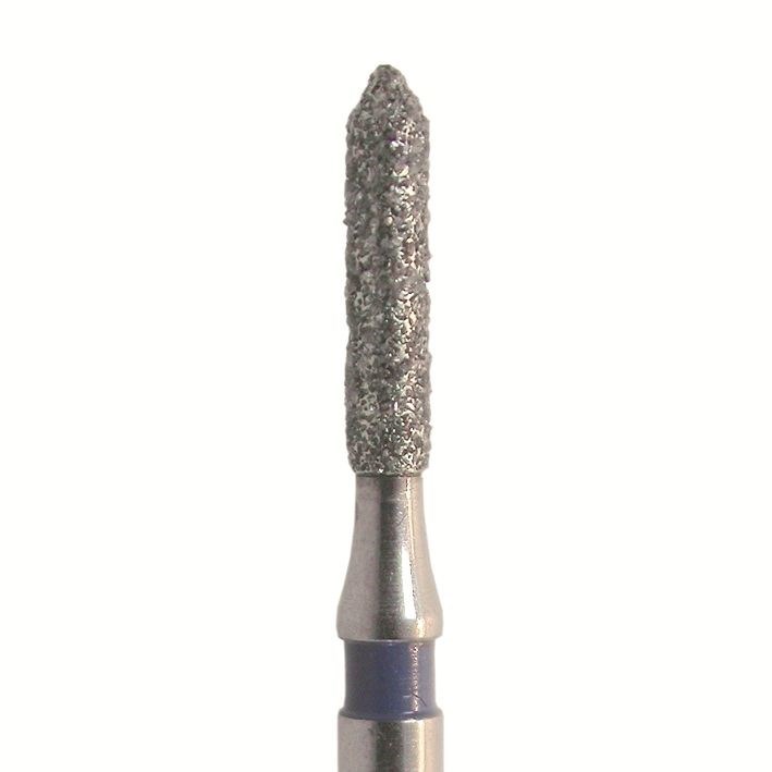 Бор алмазный для турбинного наконечника. Общая длина 19 мм, диаметр рабочей части 1,2 мм. Зернистость сверхгрубая 151-213 мкм, цветовая кодировка синяя. В упаковке 5 шт. Форма: цилиндр с заостренным концом.