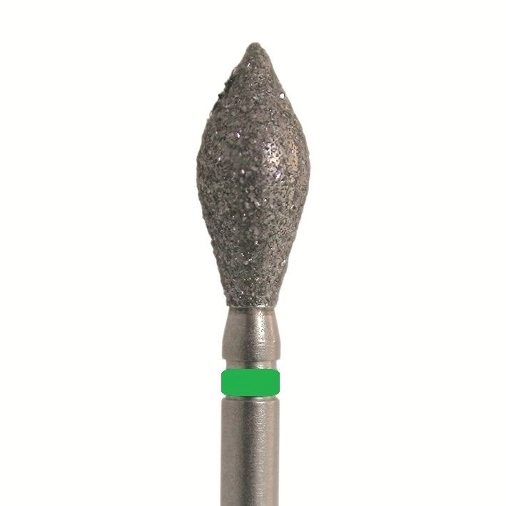 Бор алмазный для турбинного наконечника. Общая длина 19 мм, диаметр рабочей части 3,1 мм. Зернистость грубая 107-181 мкм, цветовая кодировка зеленая. В упаковке 5 шт. Форма: ромб. Артикул 899G.314.031.