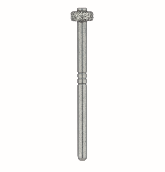 Бор алмазный для турбинного наконечника. Общая длина 25 мм, глубина (до хвостовика) рабочей части D 0,6 мм, толщина рабочей части L 1,5 мм. Зернистость средняя 64-126 мкм, цветовая кодировка синяя. В упаковке 5 шт. Форма: колесо. Артикул 908.FGXL.028
