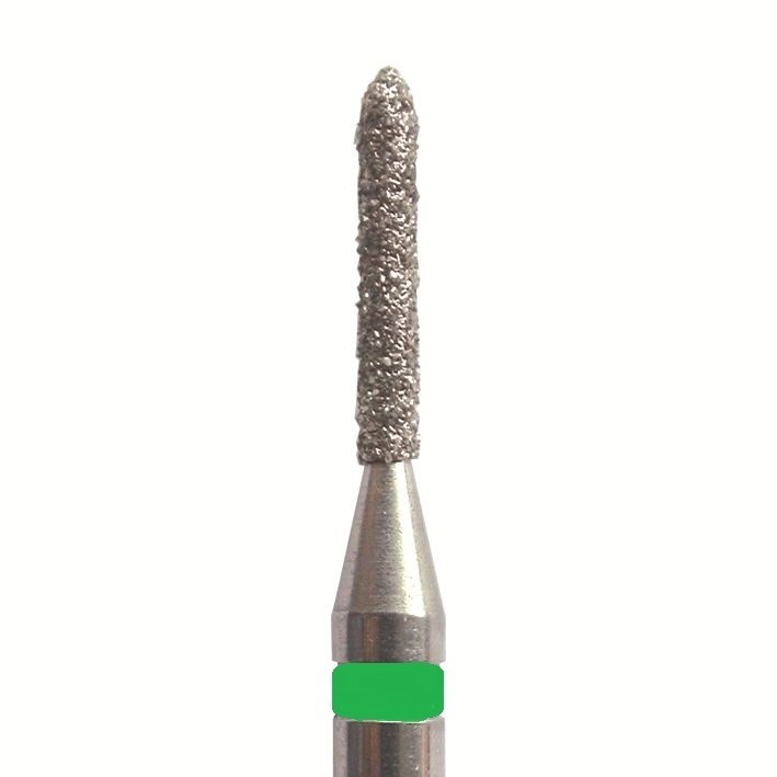 Бор алмазный для турбинного наконечника. Общая длина 19 мм, диаметр рабочей части 1,4 мм. Зернистость грубая 107-181 мкм, цветовая кодировка зеленая. В упаковке 25 шт. Форма: цилиндр с усеченным концом. Артикул SL868G.FG.014.