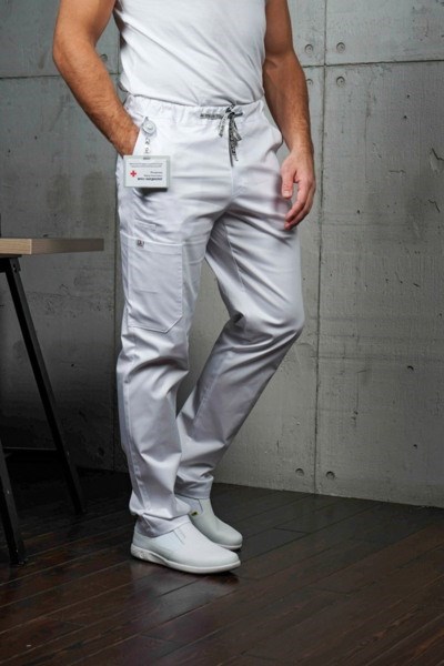 Мужские медицинские брюки "Софт" имеют полуприлегающий силуэт. Модель дополнена эластичным поясом на шнуре и удобными боковыми карманами. Ткань средней плотности, не линяет, обладает стрейч-эффектом, за счет чего обеспечивает комфорт и удобство в течение рабочего дня.