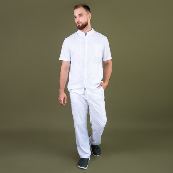 Мужские медицинские брюки TZ610 бренда Tezis имеют прямой силуэт, функциональную внутреннюю кулиску, эластичный пояс с резинкой на спине, пять шлевок для ремня, ширинку на молнии с застежкой на пуговицу. Изделие дополнено шестью карманами: два передних боковых, правый двойной накладной с эластичной петлей и люверсом, левый прорезной и задний накладной.