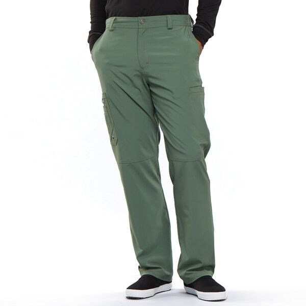 Мужские медицинские зауженные брюки Cherokee CK200AT выполнены в стиле модерн и имеют функциональную внутреннюю кулиску, эластичный пояс с трикотажной резинкой на спине, пять шлевок для ремня, ширинку на молнии с застежкой на пуговицу и скрытую ластовицу по внутреннему шву для большей легкости. Также у изделия есть два передних угловых кармана, правый двойной грузовой карман с эластичной петлей и втулкой, левый прорезной грузовой карман, задний накладной карман и коленные швы.