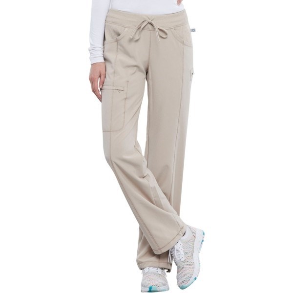 Женские медицинские брюки Cherokee 1123A выполнены в прямом современном крое, имеют заниженную талию и эластичный трикотажный пояс с регулируемой кулиской. На изделие есть передние и задние трикотажные кокетки в рубчик, угловые передние карманы, швы на передних штанинах с грузовым карманом на молнии, один накладной карман сзади, а также петля для инструментов с эластичной резинкой под левым карманом.