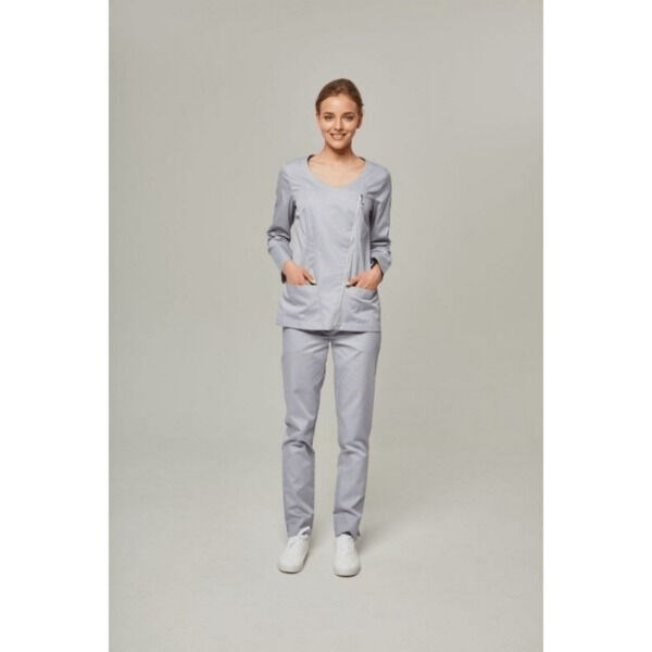 Брюки медицинские прямого кроя с эластичным поясом на резинке. Модель дополнена карманами в боковых швах, разрезами внизу и бантом из репсовой ленты на поясе.