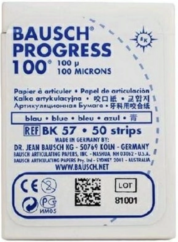 Бумага артикуляционная ВК 57, 100 мкм, 50 листов, синяя, упаковка прямых полосок, в пластиковом боксе.