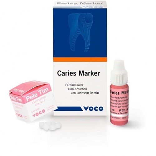 Полость обработать Кариес Маркером, оставить для воздействия на 5 - 10 секунд (не дольше!) и затем промыть водяным спреем. Жидкость лучше всего наносить с помощью поролонового шарика Пеле Тим.