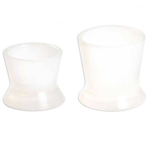 Чаши изготовлены из силиконовой резины, химически стойкой к воздействию мономеров затворных жидкостей для пластмасс. Высокая эластичность чашек позволяет без труда извлекать из них остатки полимеризованной пластмассы. Основание чашек, выполненное в форме «присоски», создает дополнительное удобство в работе.