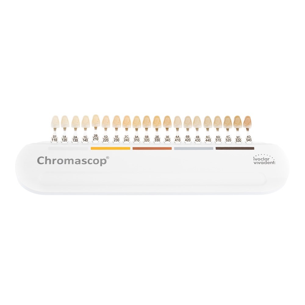 Шкала расцветок Chromascop Shade Guide служит для определения цвета различных продуктов фирмы Ivoclar Vivadent. Это позволяет просто и удобно комбинировать эти продукты в пределах одной цветовой системы. Благодаря логичному распределению отдельных цветов шкала Chromascop помогает определить цвет точно и эффективно. 20 основных цветов разделены на 5 наглядных вынимающихся цветовых групп.