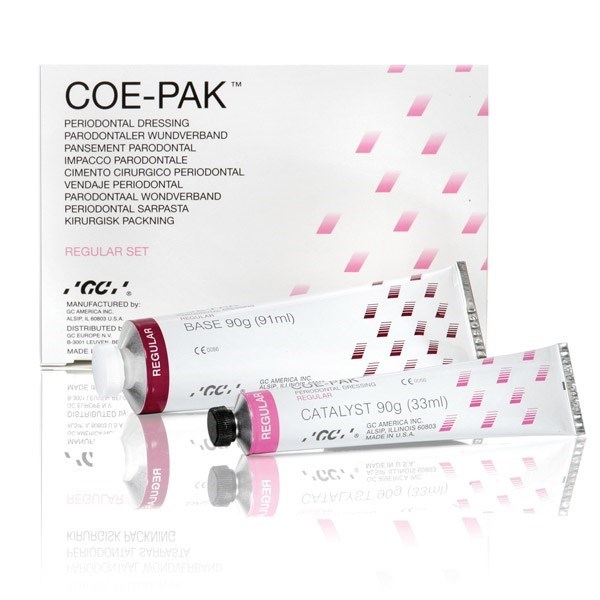 Coe-Pak пластмасса стоматологическая (двухкомпонентная безэвгенольная, для парадонтальных повязок), набор в составе: туба с базой (90 г.), туба с катализатором (90 г.).