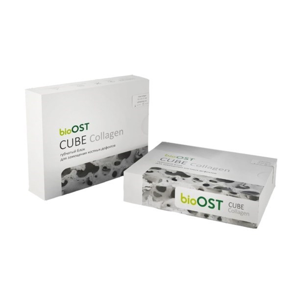 CUBE Collagen - биоматериал для замещения костных дефектов, заполнения лунок удаленных зубов, пластики пародонтальных дефектов. Высокоочищенный губчатый слой костной ткани фрагментируется в виде блоков различного размера и частично деминерализуется. В процессе обработки сохраняются коллагеновые и минеральные компоненты, а также природная бимодальная пористая структура. Уникальная технология обработки сырья позволяет сделать доступной всю внутреннюю поверхность имплантата. Сочетает в себе остеоиндуктивные и остеокондуктивные свойства. После имплантации подвергаются физиологическому замещению на костную ткань (срок замещения на костную ткань — 4–6 месяцев). Служит каркасом для остеогенеза. Легко моделируется, что дает возможность придать необходимую форму для максимального контакта с костью пациента. Блоки устойчивы к физическим нагрузкам, легко сверлятся во время установки имплантата.