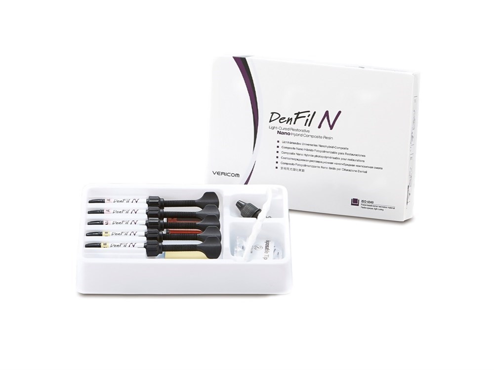 DenFil N - светоотверждаемый наногибридный полимерСветоотверждаемый реставрационный наногибридный композитный полимер DenFil N 5 Syringe kit B Pack (A2,A3,A3.5,B1,B2) with U-bond/ Денфил набор Б вариант и Ю-бонд (Vericom) Ю.Корея