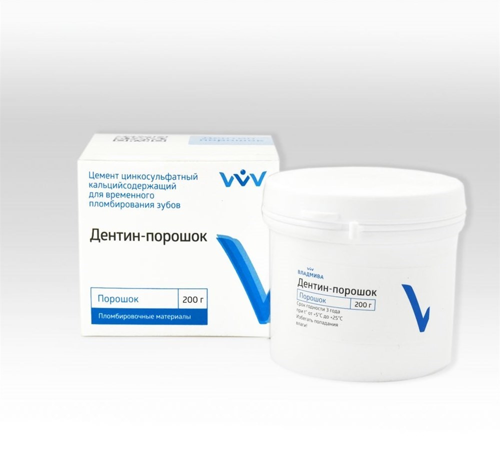Материал «Дентин-порошок» представляет собой водозатворимый кальцийсодержащий цинкосульфатный цемент, модифицированный добавками. Основными компонентами порошка являются: окись цинка, сульфат цинка и фосфаты кальция. При затворении порошка водой образуется пластичная паста.