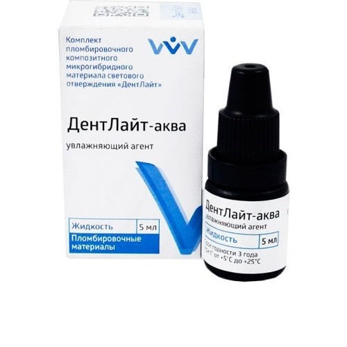 ДентЛайт-аква сохраняет поверхность дентина увлажненной, препятствуя спаданию коллагеновых волокон и повышая их проницаемость для гидрофильных (ацетоно- или спиртосодержащих) адгезивных смол. «ДентЛайт»-аква эффективно смачивает поверхность дентина и создает зону подавления кариеса в прилегающих тканях зуба.