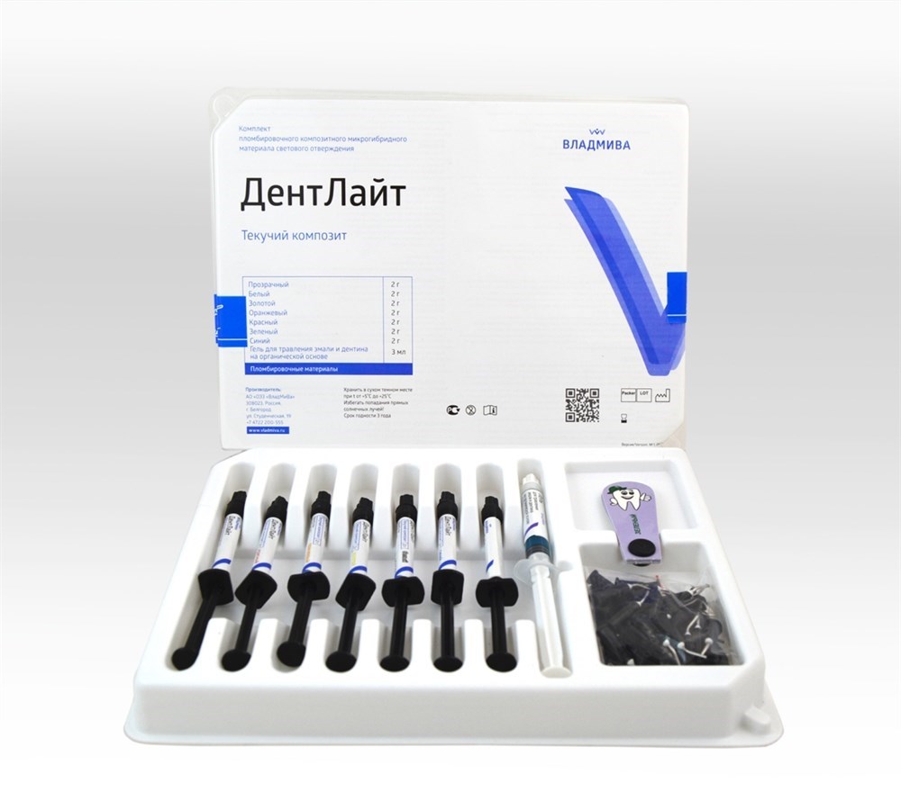 Текучий композит «ДентЛайт»-флоу представляет собой низковязкую светоотверждаемую пасту на основе полимерного связующего и модифицированного рентгеноконтрастного нанонаполнителя . Композитная паста выпускается прозрачная и разных цветов: белого, оранжевого, красного, золотого, зеленого, синего. Универсален в использовании в комбинации со всеми светоотверждаемыми композитами.
