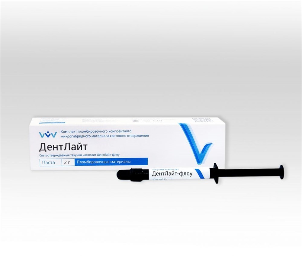 Текучий композитный материал «ДентЛайт»-флоу представляет собой низковязкую светоотверждаемую пасту на основе метакрилатных олигомеров и модифицированного тонкодисперсного нанонаполнителя. Рентгеноконтрастный наполнитель представляет собой комбинацию модифицированных барийборалюмосиликатных кластеров (0,1-3 мкм) и наноразмерного диоксида кремния (5-75 нм).