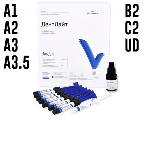 Микрогибридный композит, «ДентЛайт» оттенка: UD, А1, А2, А3, А3,5, В2, С2 (4,5 г х 7)