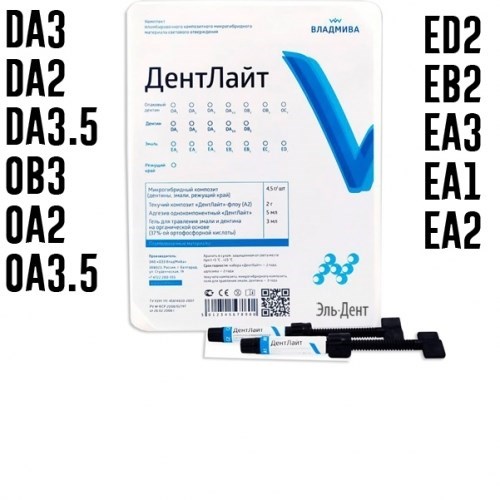 Микрогибридный композит, «ДентЛайт» оттенка: ОB3; ОА2; OА3,5; DА3; DА2; DA3,5; ED2, ЕB2; ЕA3; ЕA1; ЕA2, режущий край