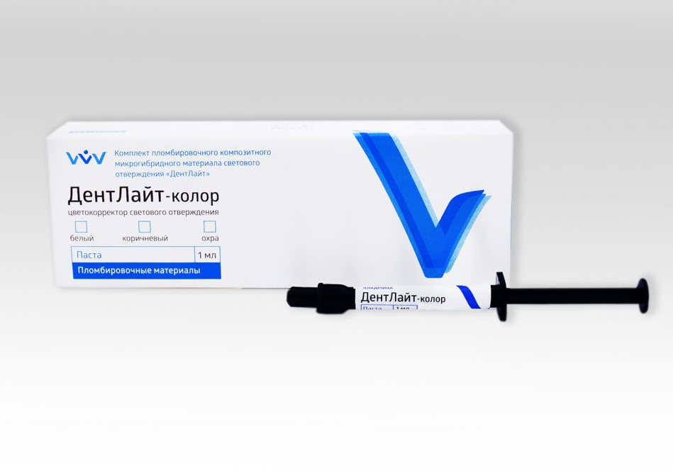 Цветокорректоры «ДентЛайт»-колор представляют собой низковязкие интенсивно окрашенные светоотверждаемые микронаполненные композитные пасты различных цветов, совместимые со всеми светоотверждаемыми реставрационными композитами.