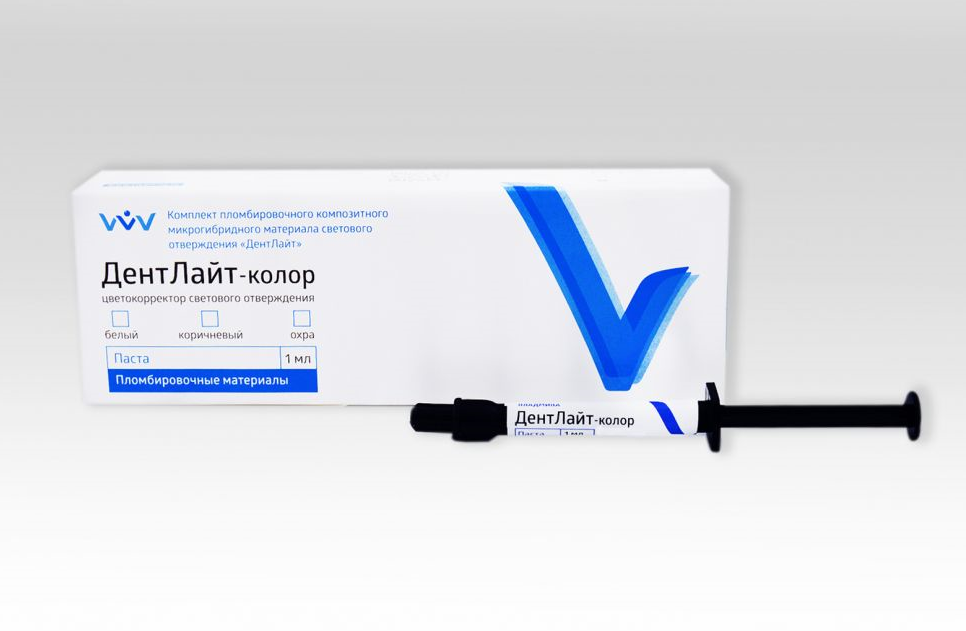 Цветокорректоры «ДентЛайт»-колор представляют собой низковязкие интенсивно окрашенные светоотверждаемые микронаполненные композитные пасты различных цветов, совместимые со всеми светоотверждаемыми реставрационными композитами.