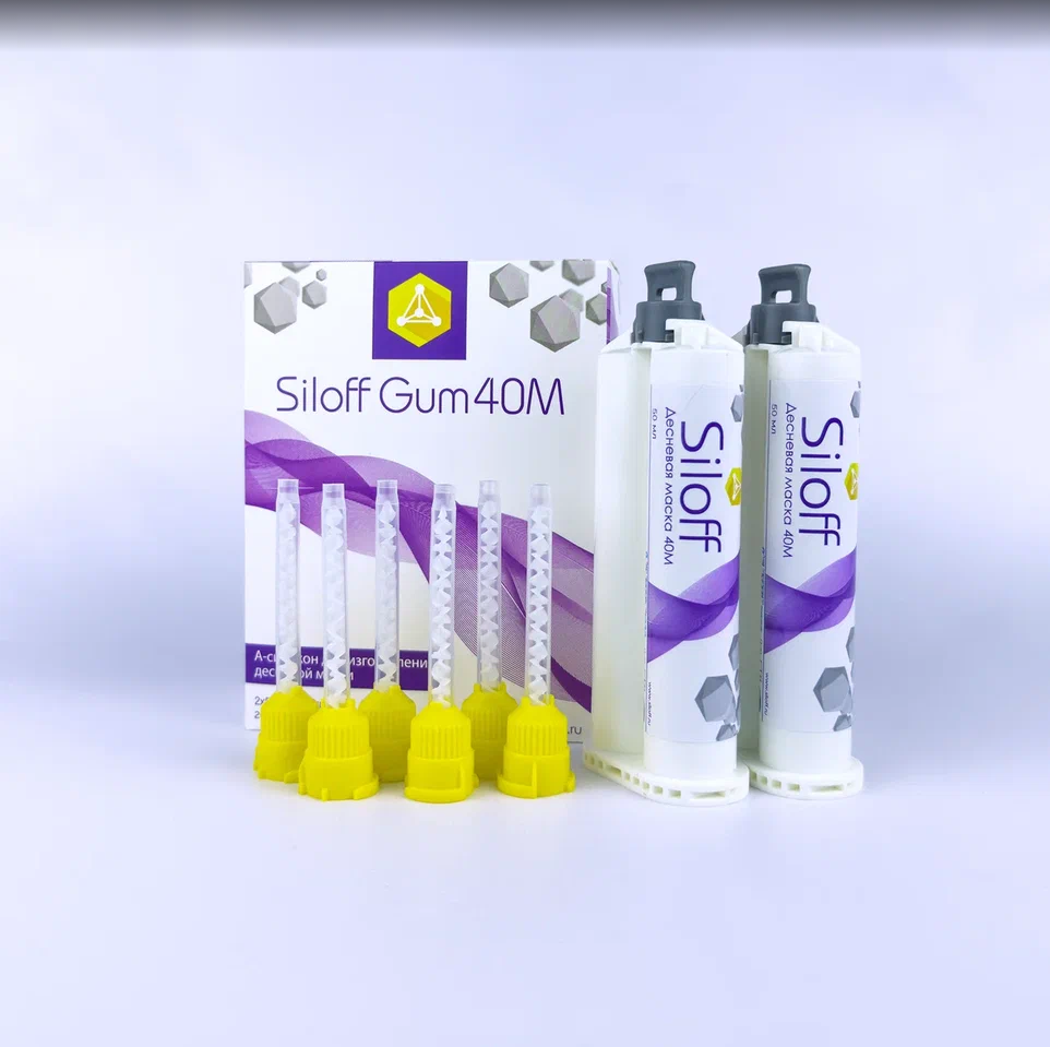 Siloff десневая маска 40M, мягкая, выпускается в картриджах по 50 мл и представляет собой силиконовую массу розового цвета, применяется для воспроизведения десны на моделях для несъёмных протезов.