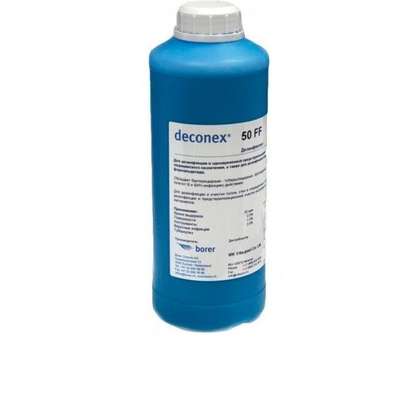 Универсальное дезинфицирующее средство Деконекс 50 ФФ - предназначено для дезинфекции и одновременно предстерилизационной очистки изделий медицинского назначения из стекла, пластмасс, резин, металлов, для дезинфекции поверхностей (а именно пола, стен в операционных и медицинских кабинетах, ванных и прачечных, туалетах, в машинах скорой помощи), мебели и инвентаря в ЛПУ. Для предстерилизационной очистки, в том числе совмещенной с дезинфекцией (без добавления или с добавлением средства «Деконекс 36 Интенсив») изделий медицинского назначения, включая стоматологические вращающиеся инструменты. Для дезинфекции разборных инструментов и приборов.