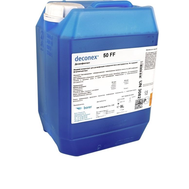 Универсальное дезинфицирующее средство Деконекс 50 ФФ - предназначено для дезинфекции и одновременно предстерилизационной очистки изделий медицинского назначения из стекла, пластмасс, резин, металлов, для дезинфекции поверхностей (а именно пола, стен в операционных и медицинских кабинетах, ванных и прачечных, туалетах, в машинах скорой помощи), мебели и инвентаря в ЛПУ.