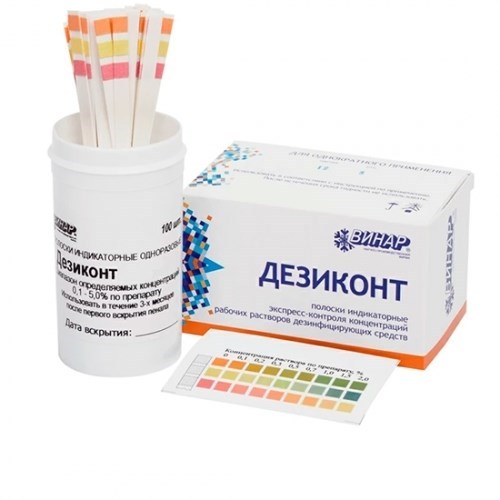 Научно-производственная фирма "Винар" выпускает индикаторные полоски серии "Дезиконт" для контроля концентраций рабочих растворов дезинфицирующих средств на основе четвертичных аммониевых соединений, хлор содержащих препаратов, альдегидов, перекисей и т.п. (см. таблицу).