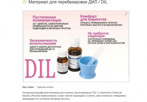 DIL — материал для перебазировки пластмассовых съёмных протезов. После получения функционального оттиска DIL начинает твердеть во рту во время пользования протезом в течение недели.