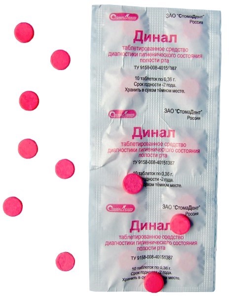 «Динал» - таблетированное средство для определения мягкого зубного налета на поверхности зубов. Используется при обучении гигиенической чистке зубов.