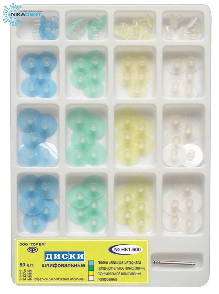 Диски 1.600 шлиф с пластиковой втулкой универсальные, набор (длина 8 мм, 20 шт №№НК1.611-НК1.614 по 5 шт, длина 12 мм, 20 шт №№НК1.621-НК1.624 по 5шт, длина 14 мм, 20 шт №№НК1.631-НК1.634 по 5 шт, длина 14 мм, 20 шт №№НК1.631-НК1.634 обратное расположение абразива по 5 шт, дискодержатель №1.111) (ТОР ВМ)