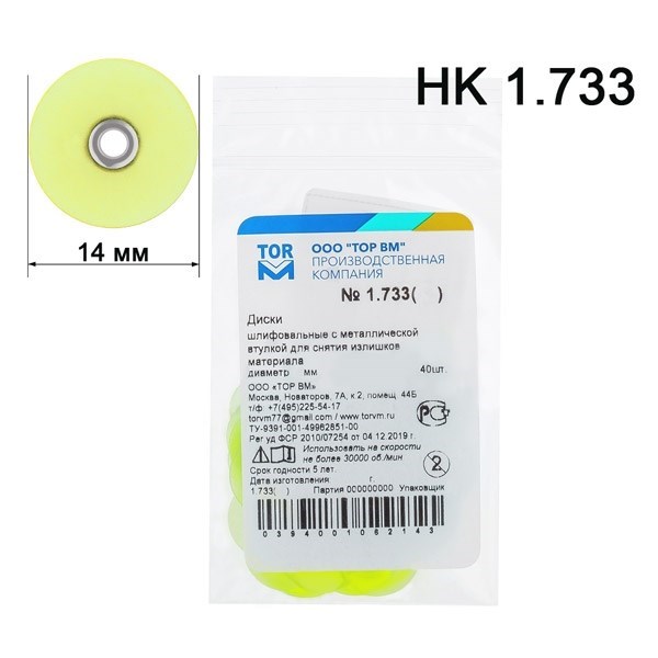 Диски 1.733, d=14 мм шлифовальные с металлической втулкой окончательного шлифования 40 шт, желтые (ТОР ВМ)
