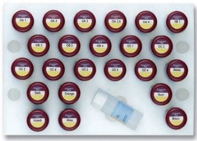 Порошкообразный опак, пастообразный опак, лайнер соотвветствующий по цвету оттенкам зубов. Очень низкая способность пропускать свет обеспечивает хорошее покрытие каркаса.