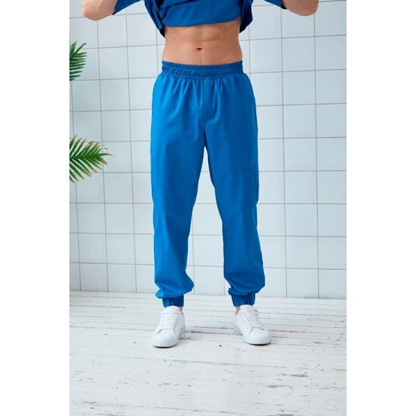 Удобные и стильные мужские медицинские брюки имеют среднюю посадку и зауженный к низу крой с манжетами на резинке. Модель дополнена карманами в боковых швах. Брюки идеально садятся на любой фигуре за счет удобного пояса на резинке.