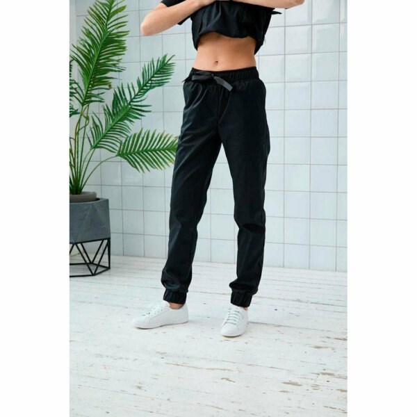 Брюки медицинские зауженного кроя с эластичными манжетами снизу и поясом на резинке. Модель дополнена боковыми карманами и бантом из репсовой ленты на поясе.