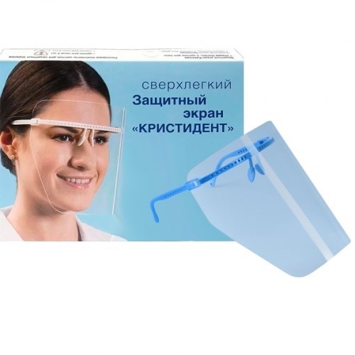 Описание: Экран защитный ГОЛУБОЙ "Кристидент" ( Классик )Экран защитный для лица многоразовый предназначен для защиты лица медицинского персонала от воздействия прямого или частично бокового попадания брызг жидкостей и пыли при использовании в стоматологии и челюстно-лицевой хирургии, а также маникюрном, педикюрном сервисе и косметологии.