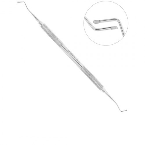 Каждая из симметричных рабочих частей двустороннего инструмента имеет форму овальной ложки с острыми краями, которые позволяют атравматично удалять размягченный дентин или эмаль из кариозной поверхности.