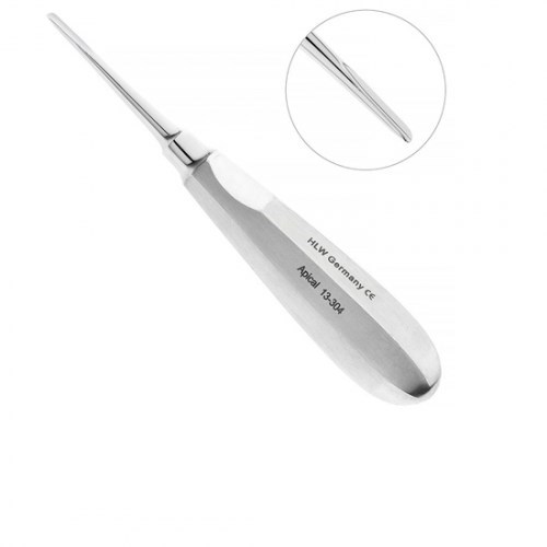 Описание: Элеватор 3,0 мм ApicalДля удаления корней зубов верхней челюсти, атипично расположенных зубов верхней челюсти и, в ряде случаев, для удаления третьих моляров нижней челюсти применяется апикальный элеватор. Производителем инструмента является компания HLW Dental Instruments.Щечка элеватора имеет овальную форму с желобовидным углублением и ширину рабочей части 3 мм. Щечка инструмента вводится в лунку зуба и по принципу рычага осуществляется удаление корней и зубов в ротовой полости. У элеватора ручка, соединительный стержень и рабочая часть находятся на одной прямой. Инструмент надежно фиксируется и не скользит в руке, благодаря восьмигранной укороченной ручке элеватора.