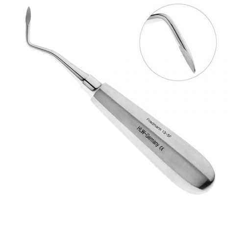 Описание: Элеватор 3,0 мм Friedmann изогнутый (от себя)Компанией HLW Dental Instruments изготовлен элеватор конструкции Фридманна, который применяется для удаления корней зубов на нижней челюсти, а также удаления нижнечелюстных дистопированных зубов и зубов с разрушенной коронковой частью.Ширина щечки изогнутого инструмента 3 мм. Рабочая часть элеватора слегка вогнутая, острая на конце и ориентирована от себя. Щечка инструмента вводится между корнем зуба и стенкой альвеолы, и путем вращения рукоятки элеватора против хода часовой стрелки осуществляется вывихивание зуба.На поверхности ручки элеватора расположены грани, которые обеспечивают надежную фиксацию и предотвращают скольжение инструмента в руке. Благодаря такой ручке элеватор позволяет снизить нагрузку на руки и способствует успешному проведению операции.
