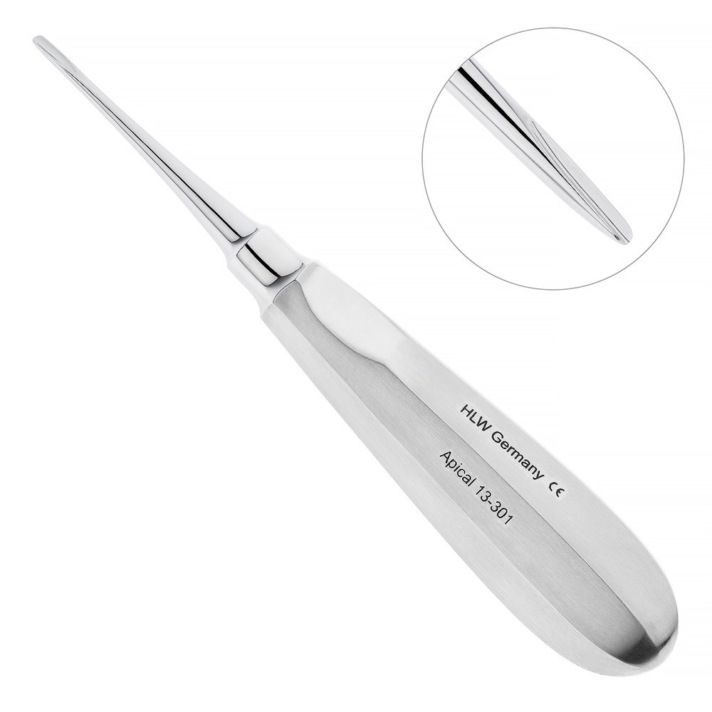 Элеватор апикальный используется для удаления корней зубов верхней челюсти, атипично расположенных зубов верхней челюсти и, в ряде случаев, для удаления третьих моляров нижней челюсти. Производителем инструмента является компания HLW Dental Instruments.