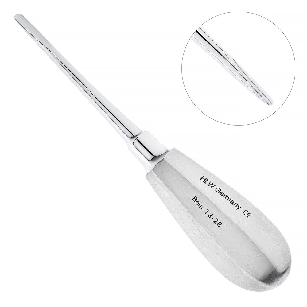 Для удаления корней и зубов на верхней и, в ряде случаев, на нижней челюсти применяется элеватор конструкции Бейна производства немецкой компании HLW Dental Instruments.